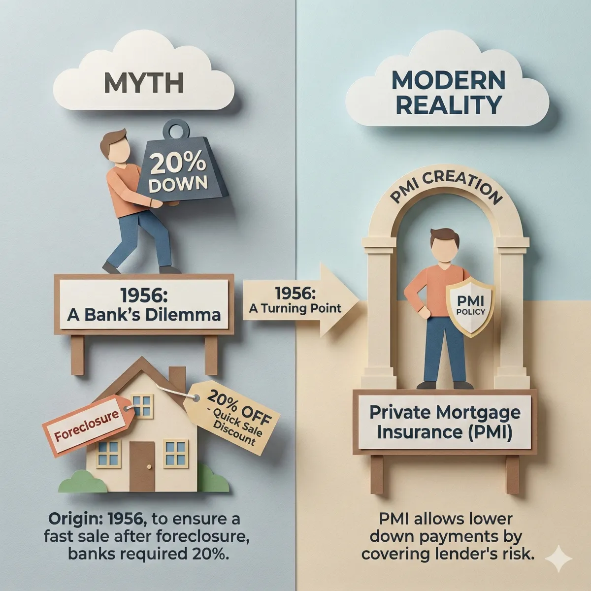The Origin of the Myth: This "rule" originated around 1956 when real estate information did not flow as freely as it does today. If a bank had to foreclose on a home, they wanted to sell it as quickly as possible to get it off their books. To ensure a fast sale, they often sold properties at a 20% discount. Therefore, requiring a 20% downpayment acted as the bank’s insurance policy.